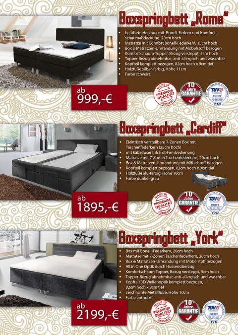 Kaum ein anderer Bettentyp hat in den letzten Jahren so stark an Bedeutung für die Einrichtung des heimischen Schlafzimmers gewonnen wie die Boxspringbetten. Lange Zeit kam man nur in den Luxushotels weltweit und auf Kreuzfahrtschiffen in den Genuss des besonderen Schlafkomforts und der vielen weiteren positiven Eigenschaften der Boxspringbetten. Heutzutage wird diese Art von Betten von einer Vielzahl an Bettenherstellern gefertigt. Dementsprechend gibt es ein breites Angebot an Boxspringbetten in vielen verschiedenen Ausführungen und Preisklassen. Der mit dem Bettentyp verbundene Luxus und der ausgezeichnete Komfort sind jetzt also für Jedermann erschwinglich geworden.